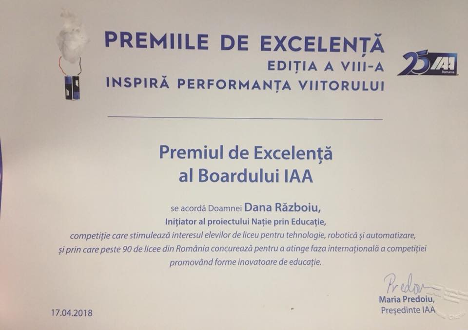 „Sunt foarte fericită pentru premiul acordat de IAA. Noi toți cei implicați în proiect am muncit foarte mult pentru ca această competiție să existe în România. E o contribuție mică, dar importantă pentru modernizarea învățământului. Ne adresăm școlilor de stat din România. Facem ceea ce Ministerul Educației nu face, și anume cursuri de robotică în școală. Programul este mai mult decât un concurs de robotică, este o lecție despre prietenie, colaborare, fairplay”, a declarat Dana Războiu, fondator „Nație Prin Educație”.