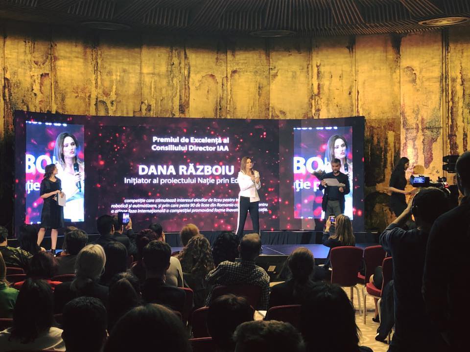 Dana Războiu a primit marți seară Premiul de Excelență al Boardului IAA pentru proiectul „Nație Prin Educație”, distincție acordată pentru inițierea și susținerea celei mai mari competiții de robotică pentru licee din România, FIRST Tech Challenge Romania. În prezența a peste 150 de profesioniști ai industriei de advertising și comunicare, în cadrul celei de-a VIII-a ediții a Galei Premiilor de Excelență IAA România au fost acordate 11 premii, recompensând excelența în marketingul și comunicarea autohtonă.